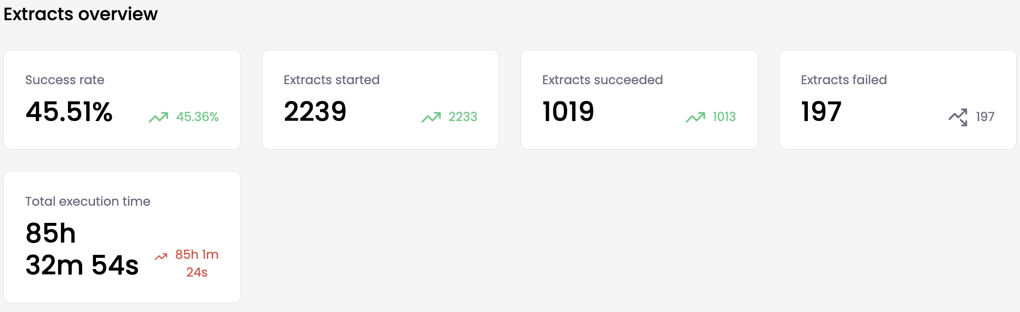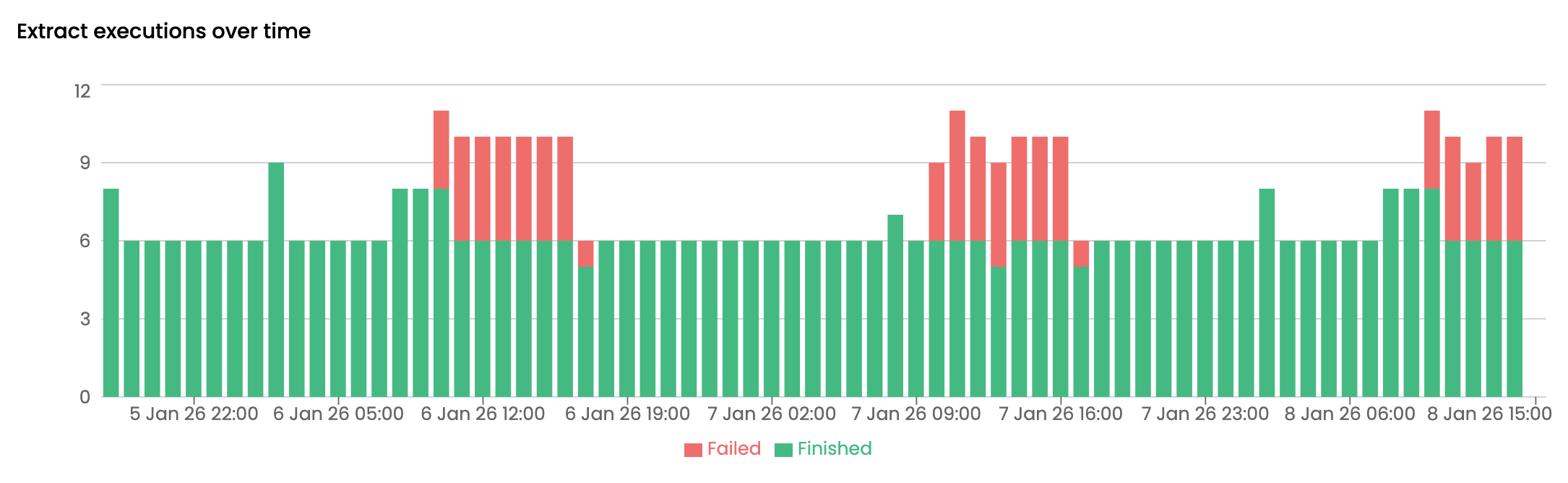 Get a bird’s eye view of your extracts, with data on success rate, failed extracts and total execution time available at a glance. Can be configured to monitor up to 5 sources at a time.