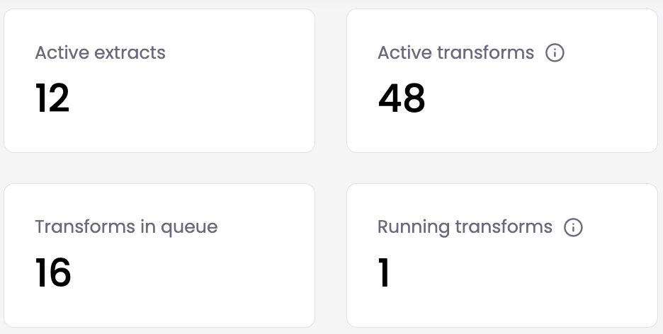 Get an overview of active extracts, active transforms (scheduled & non-scheduled), transforms in queue and running transforms. Content can be filtered by custom date ranges.
