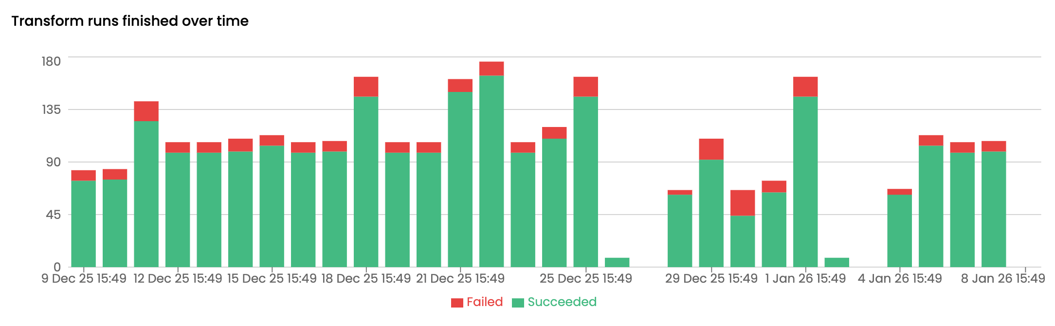 Quickly gain insights into your transforms’ performance. View total number of transforms over time, broken down by success/failure using color coding. You can also view your 10 slowest-running transforms and the 10 most recently failed.